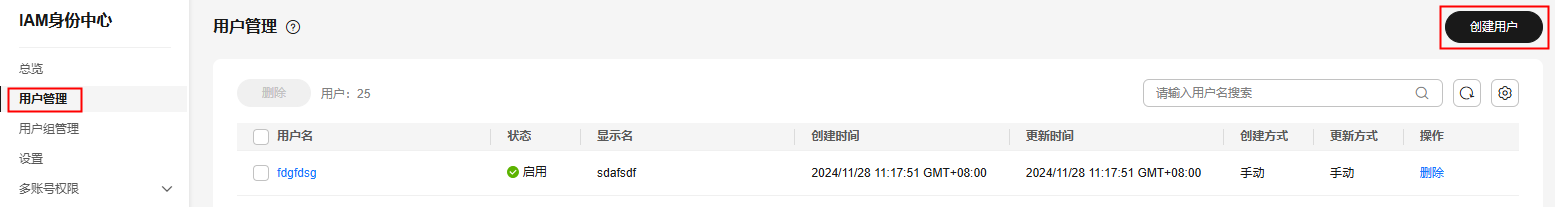 ,选择“管理与监管 > iam身份中心”,进入“iam身份中心”页面。 - 单击左侧导航栏的“用户管理”,进入“用户管理”页面。
