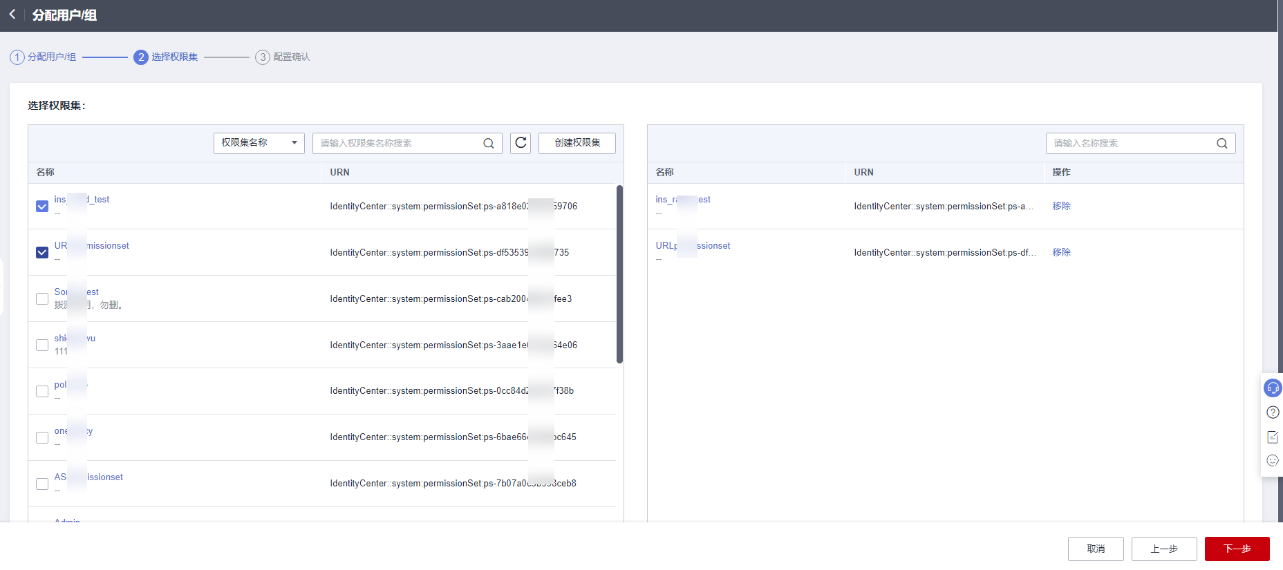 - 进入“选择权限集”页面,在权限集列表中勾选需要关联的权限集,单击“下一步”。
