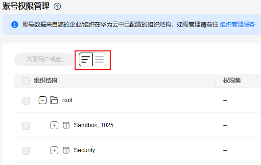 账号权限管理列表默认以组织结构树的形式显示,在列表左上方单击