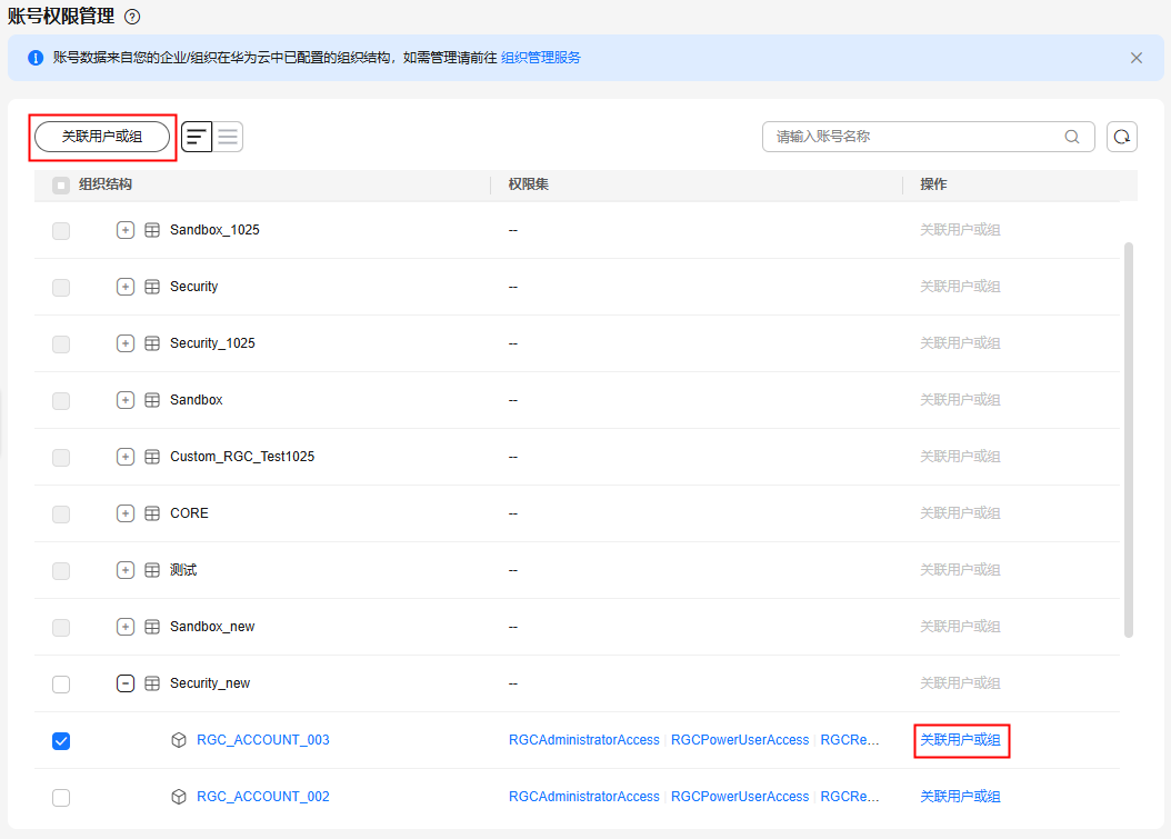 您也可以在账号列表中单击某一账号操作列的“关联用户或组”。
