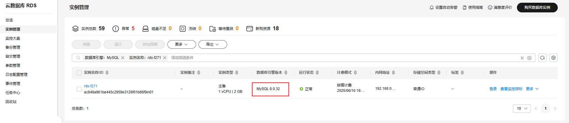 - 通过rds实例管理页面,查看数据库实例的版本号。