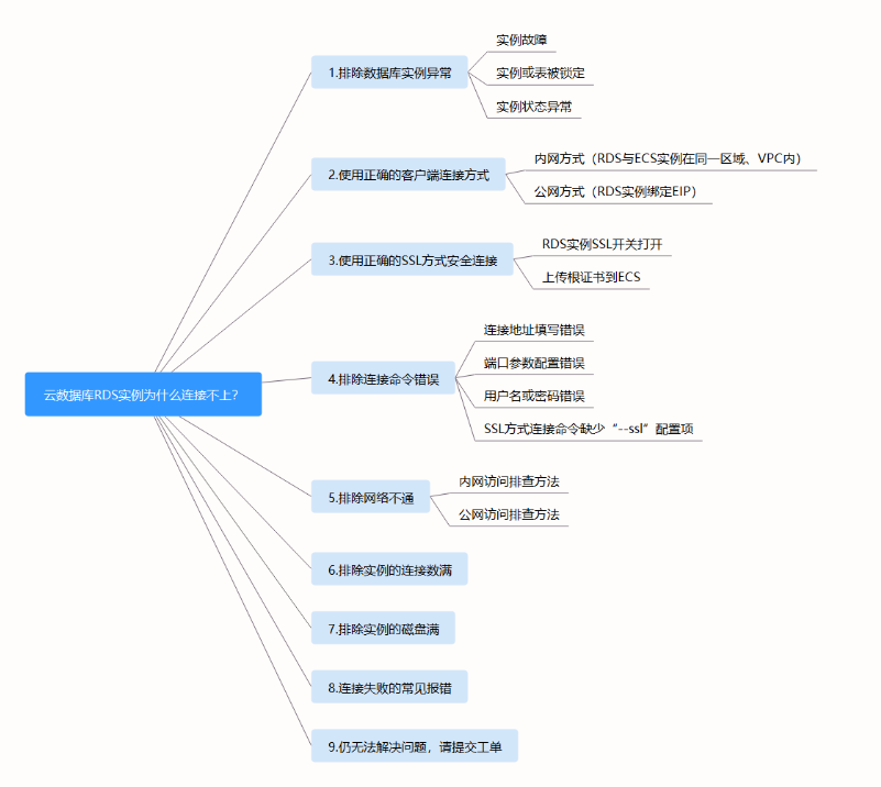 排查是否限制了实例的连接数,导致连接失败,具体请参见连接rds实例失败的常见报错。