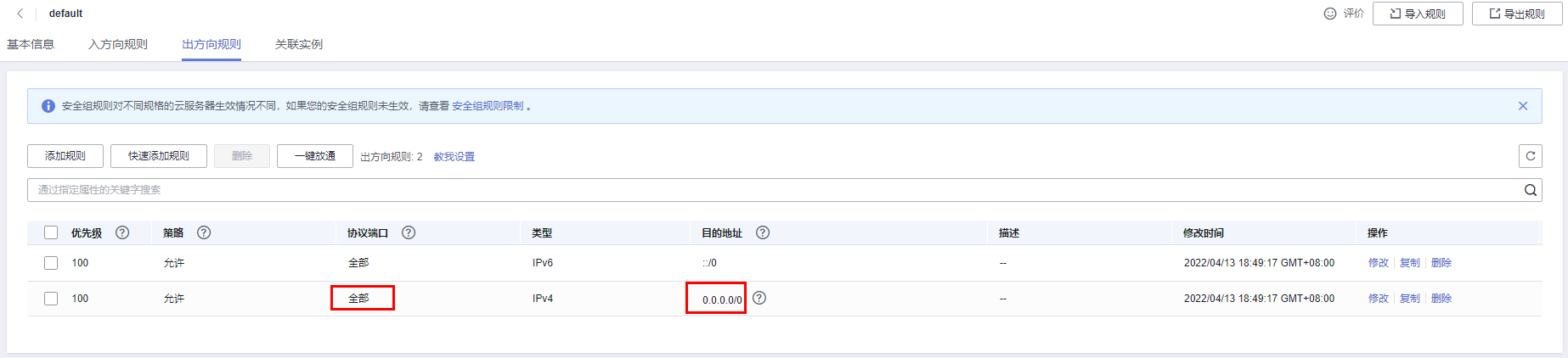 - 查看ecs的安全组的出方向规则,如果目的地址不为“0.0.0.0/0”且协议端口不为“全部”,需要将rds实例的内网ip地址和端口添加到出方向规则。