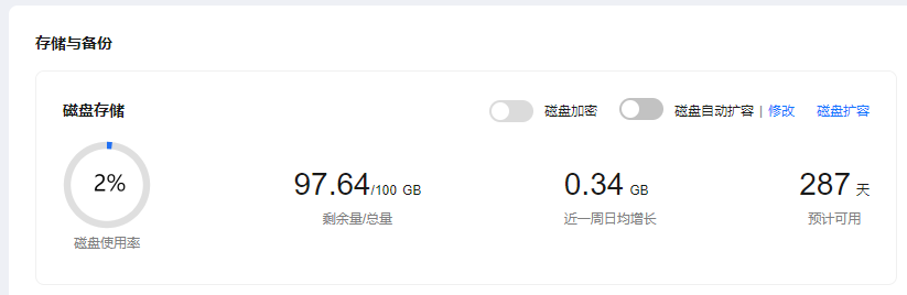 选择目标实例,单击实例名称,进入“概览”页面。在“存储与备份”模块,查看磁盘使用率。