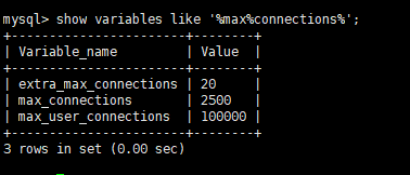 - 通过show variables like '%max%connections%';命令查看实例连接数,示例: