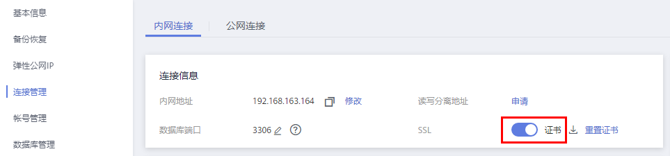 - (推荐)ssl方式:实例连接管理页面的ssl开关开启,并且上传证书到ecs。