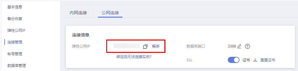 不能通过内网ip地址访问rds实例时,使用公网访问,建议单独绑定弹性公网ip连接ecs(或公网主机)与rds实例。