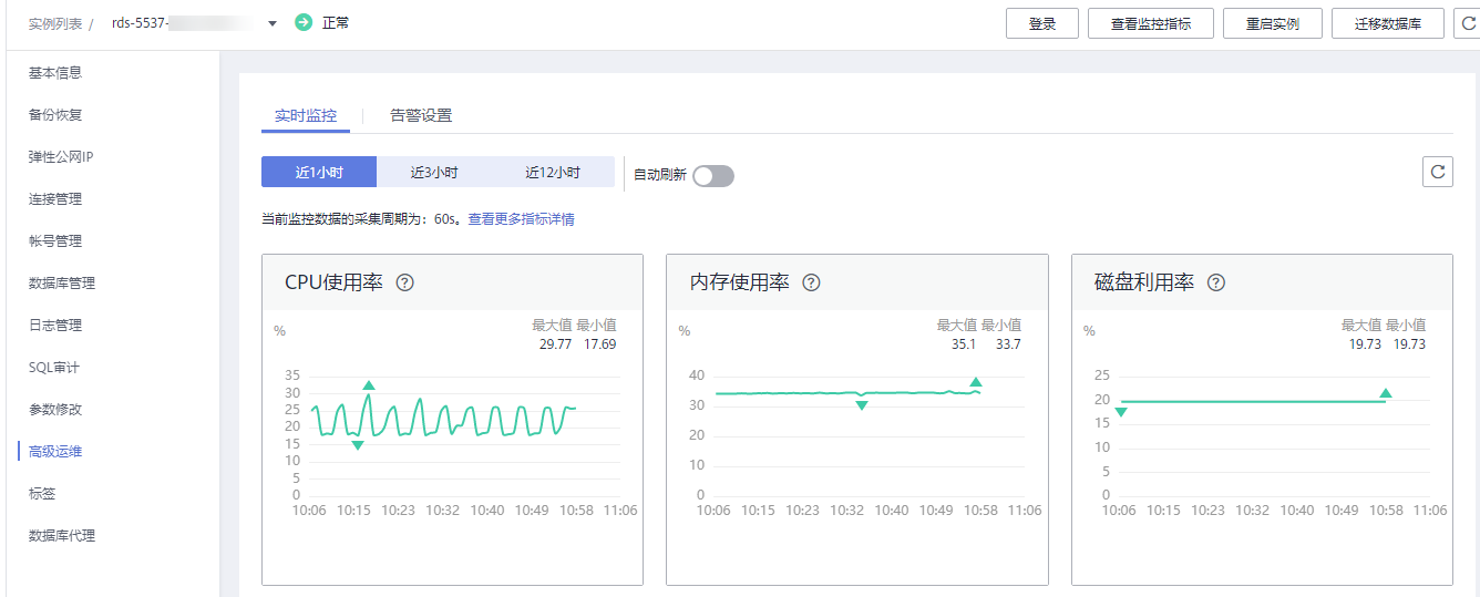 单击云数据库rds实例名称,在“高级运维”页面可以查看内存使用率监控指标。