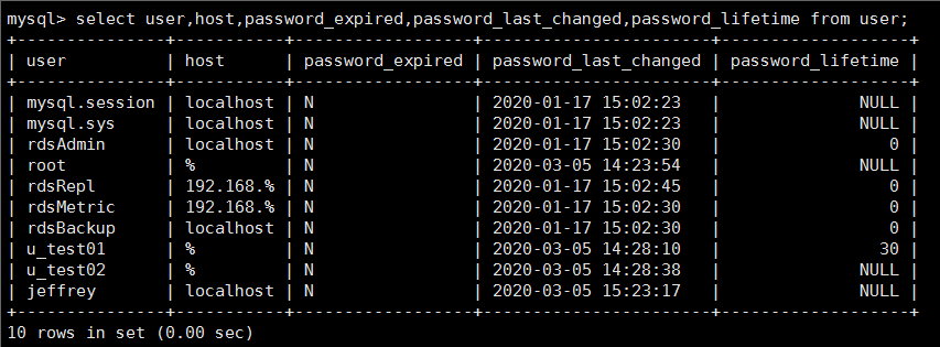 mysql> select user,host,password_expired,password_last_changed,password_lifetime from user;