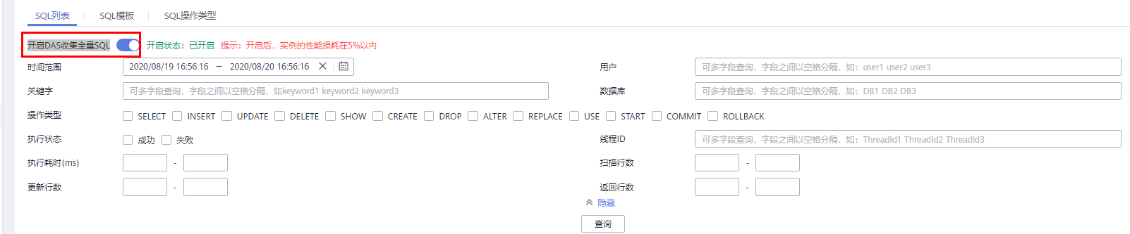- 在“sql列表”页签中,单击“开启das收集全量sql”,您可以通过选择时间范围、用户、关键字、操作类型、数据库等sql查询条件单击“查询”,获取当前实例所执行过的sql信息。