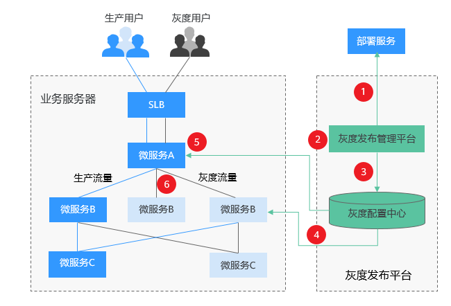 - 运维人员在灰度发布管理台配置微服务灰度策略,支持配置同一个微服务不同版本的灰度规则,以及不同微服务相同的灰度规则。