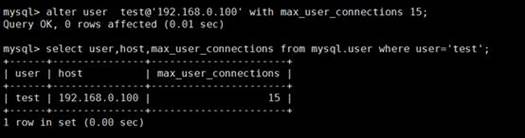 alter user test@‘192.168.0.100' with max_user_connections 15。