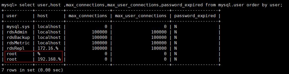 在此案例中,root@'%'为console创建实例时设置密码的账号。