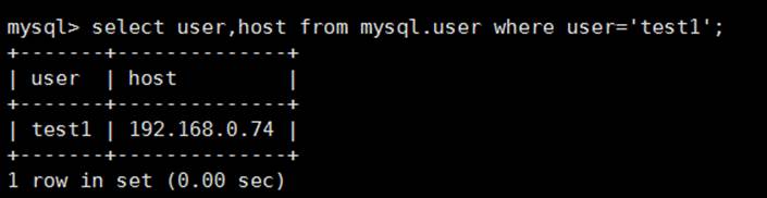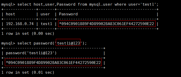 select password(‘test1i@123'); select host,user,password from mysql.user where user=‘test1';