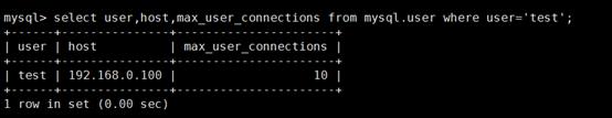 select user,host ,max_user_connections from mysql.user where user=‘test';