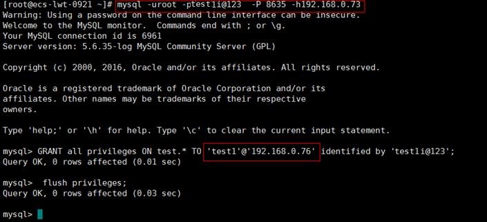 grant all privileges on test.* to 'test1'@'192.168.0.76' identified by 'test1i@123';