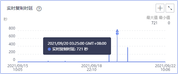 只读实例的ces监控上,出现只读复制时延会在某个瞬间升高并回落,如下图: