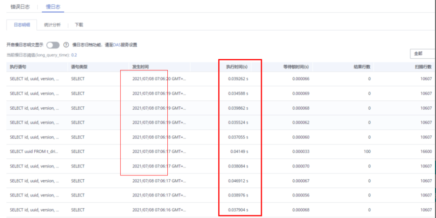 在控制台将“long_query_time”参数值从0.1s修改为0.2s后,慢日志中还存在小于0.2s的慢sql执行记录。