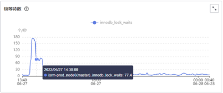 14点~15点之间数据库出现大量行锁冲突,内核中大量update/insert会话在等待行锁释放,导致cpu使用率达到70%左右,数据库操作变慢。