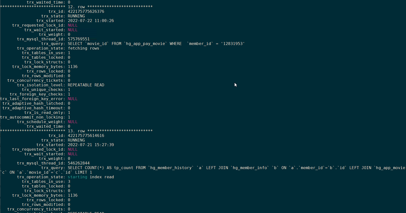 发现有一直未提交的长事务,如上图所示(事务一天前开始),该长事务导致undo log一直未清理,累计了近一天的undo log,导致磁盘占用高。