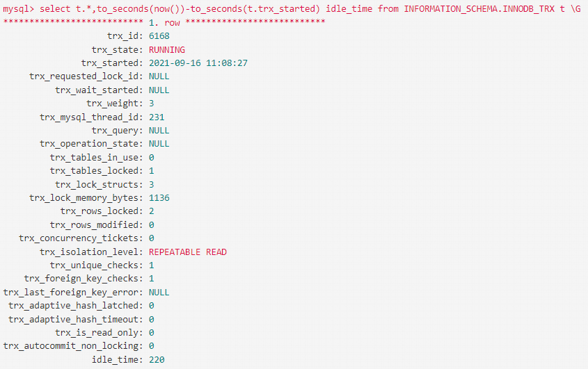 select t.*,to_seconds(now())-to_seconds(t.trx_started) idle_time from information_schema.innodb_trx t \g;