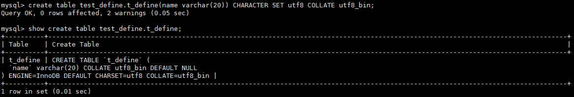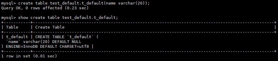 示例1:不显式指定字符集、字符序的情况下创建数据库和数据表。