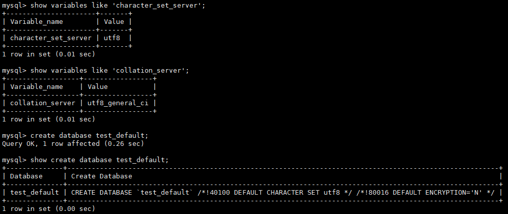 - 在创建数据库时,如果未显式指定库的字符集和字符序,则库的字符集和字符序采用character_set_server和collation_server参数的值;如果显式指定,则使用指定的字符集和字符序。