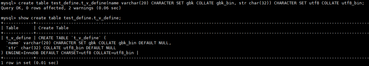 示例4:显式指定字段的字符集、字符序的情况下创建数据表。
