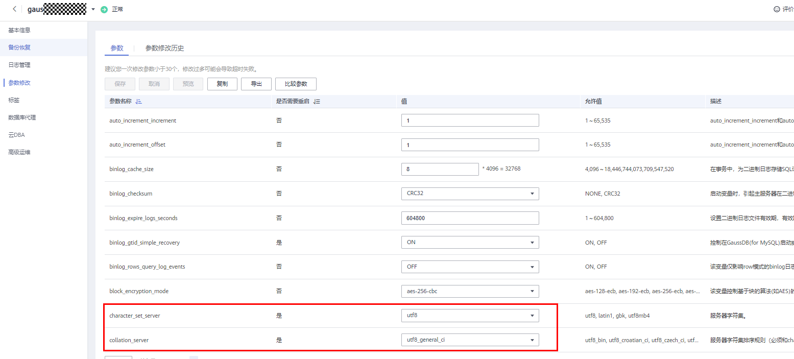 参数组中默认character_set_server=utf8、collation_server=utf8_general_ci,可以在界面修改参数值。