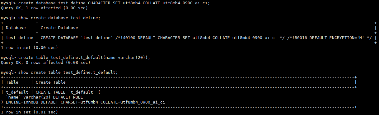 - 在创建数据表时,如果未显式指定表的字符集和字符序,则表默认字符集和字符序使用所在数据库的字符集和字符序;如果显式指定,则使用指定的字符集和字符序。