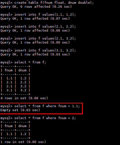 mysql中涉及浮点数的类型有float和double。如下示例中遇到的问题: