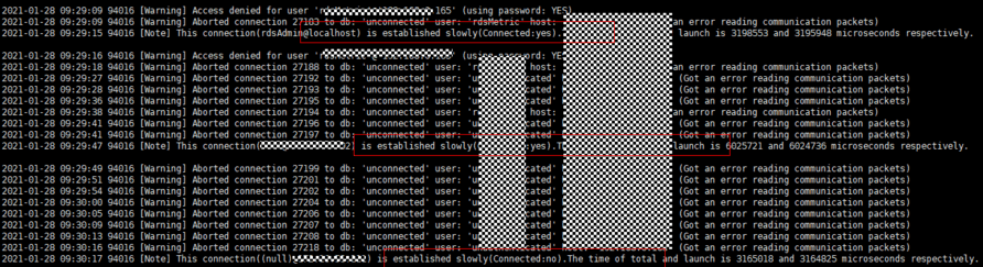 - 查看rds mysql的错误日志,观察是否有如下信息:connection xxx is established slowly。示例: