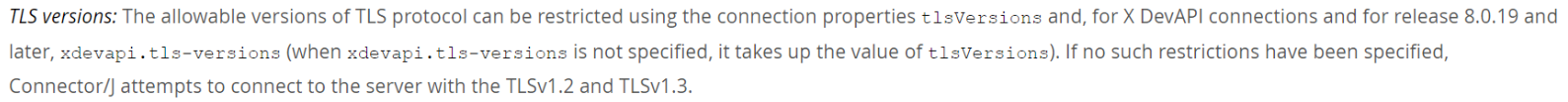 发现rds for mysql为tls v1.2版本,自建mysql为tls v1.1版本,存在差异。进一步确认客户端tls版本,与自建mysql一致,因此出现连接自建mysql成功,连接云上rds for mysql失败。