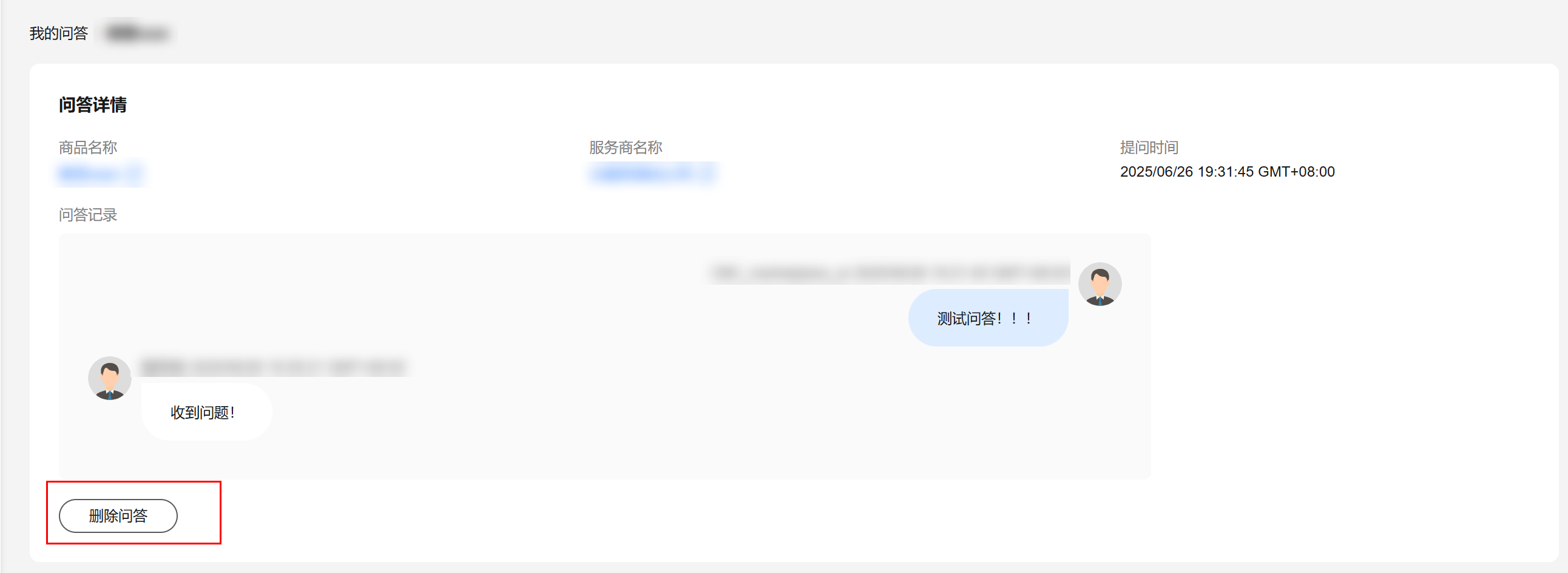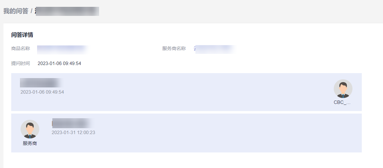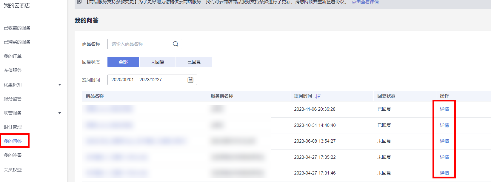 - 在我的问答列表设置查询条件,选择需要查看的问题,单击右侧操作栏的“详情”。