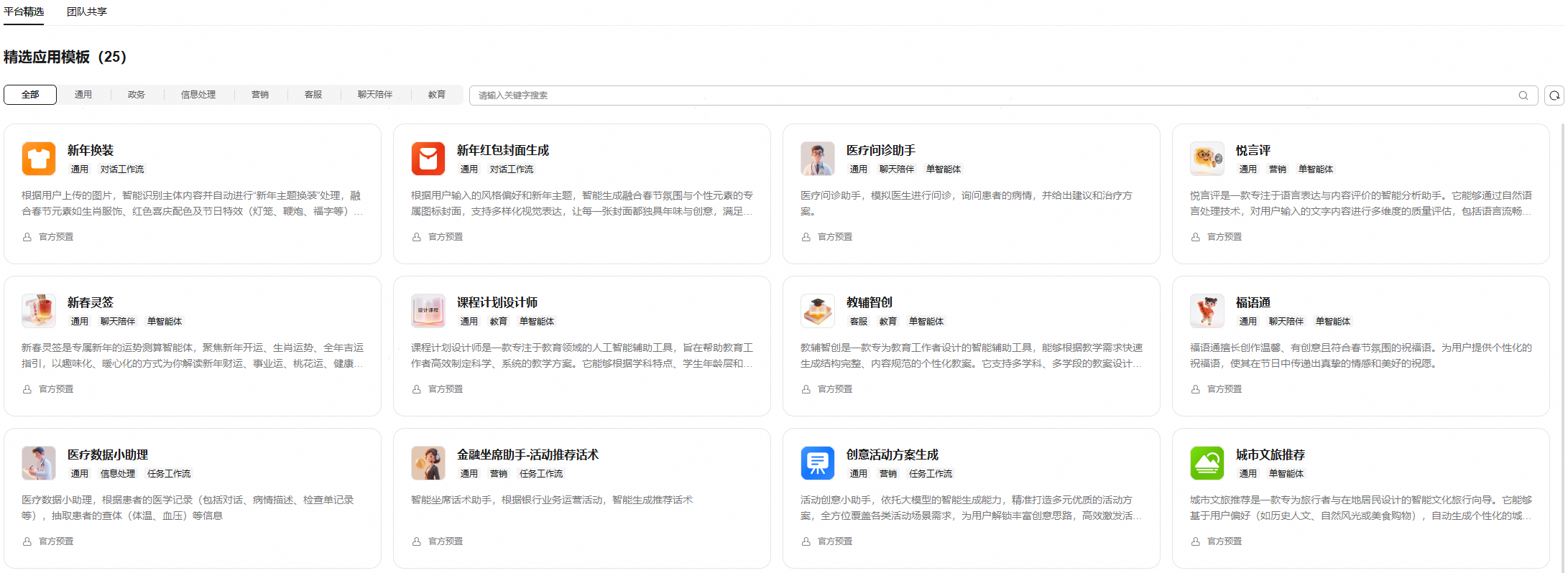 平台汇集了官方预制及团队共享的高频场景应用模板,预置的模板覆盖通用、政务、信息处理、客服、营销、陪伴聊天、教育等多个行业领域。