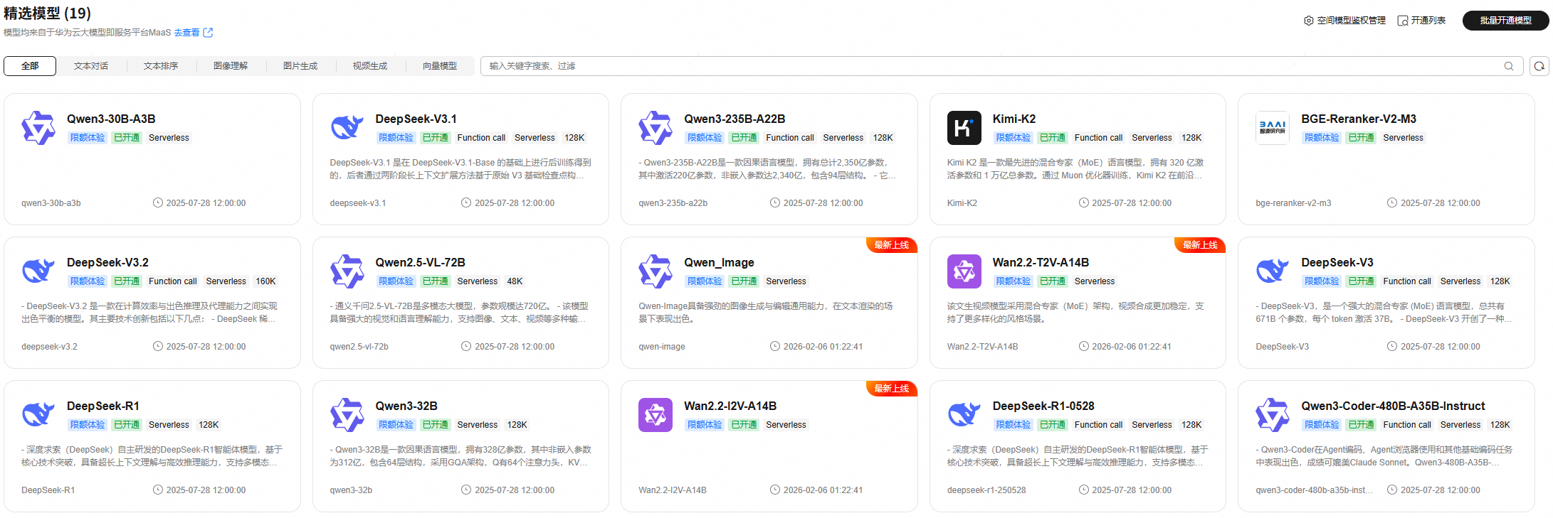 资产广场深度对接华为云大模型即服务平台modelarts studio (maas)服务,预置了多种主流开源模型在内的优质底座资源,提供多规格、多性能的推理引擎选择,满足从轻量化交互到复杂逻辑推理的不同需求。