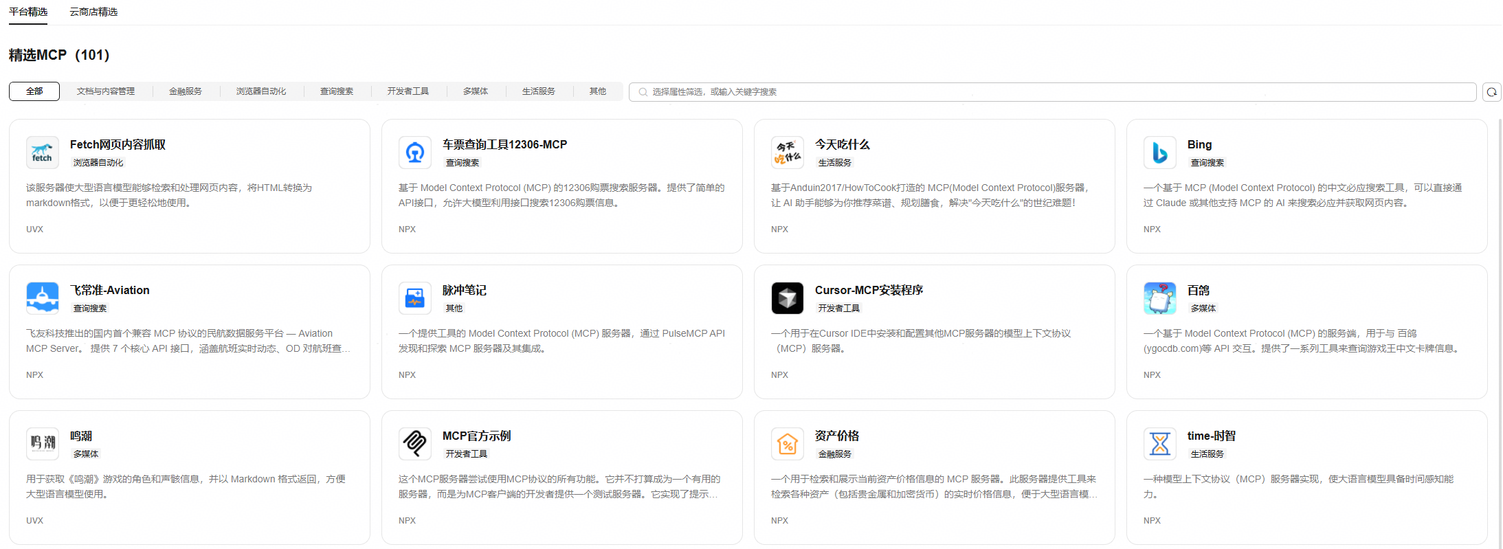平台精选了丰富的mcp资源,例如mcp车票查询工具、内容抓取转换器、可视化图表mcpserver、高德地图等。通过“安装即使用”的模式,可以快速便利后续的智能体开发环节。