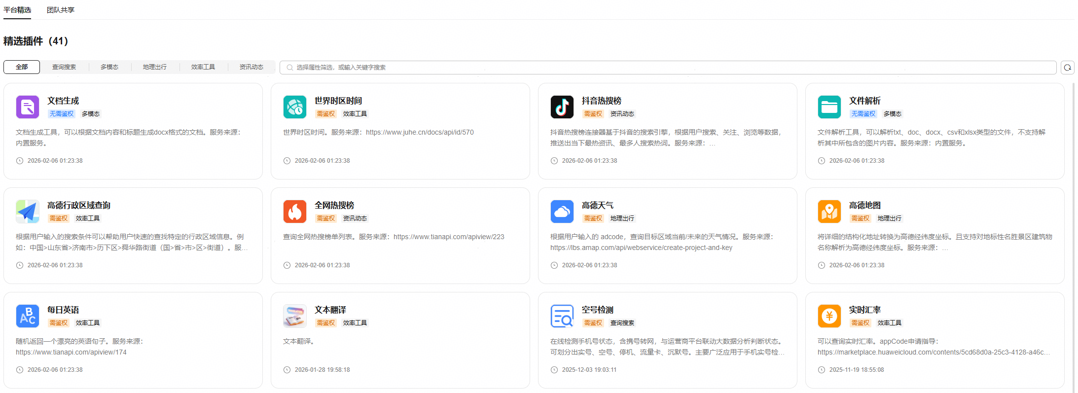 预置了平台精选的各类插件工具,同时汇集了团队共享的插件。这些插件功能多样,广泛覆盖多个实用领域,能够显著提升智能体的应用能力。