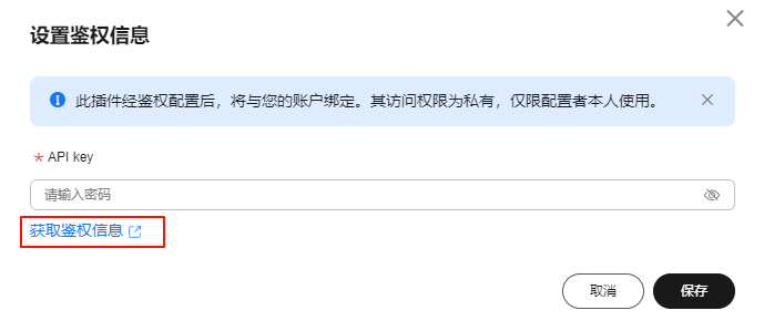 - 在弹出的“设置鉴权信息”对话框中,输入该插件的api key。