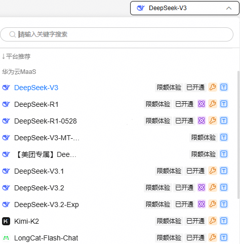 - 体验:表示该平台预置大模型可以体验,会话轮数最大为20次。