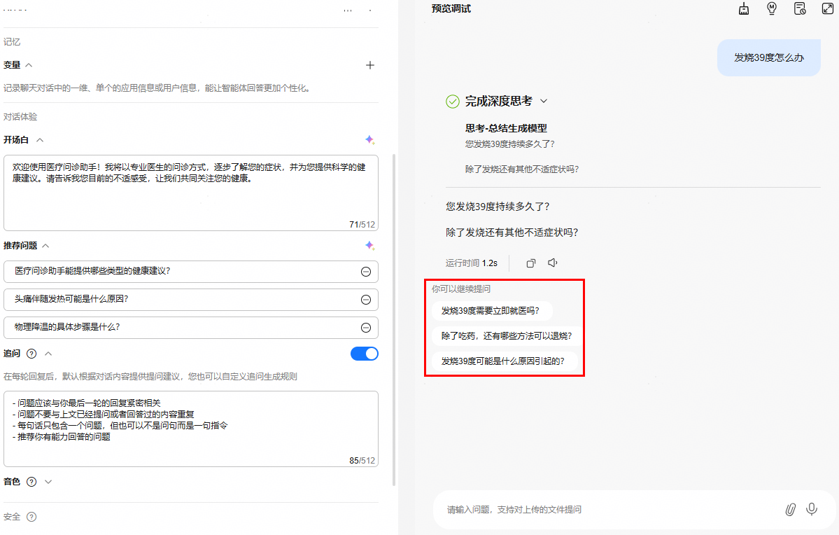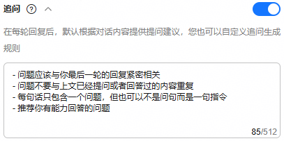 用户自定义追问生成规则:用户可以根据需求,自定义追问生成规则。通过这些规则,智能体在每轮回复后,能够根据对话内容智能地提供提问建议,从而挖掘用户的潜在需求。
