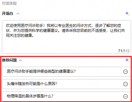 在“对话体验 > 推荐问题”中,可填写推荐问题,也可单击“智能添加 > 确定”按钮智能添加推荐问题。推荐问题至多配置3条。