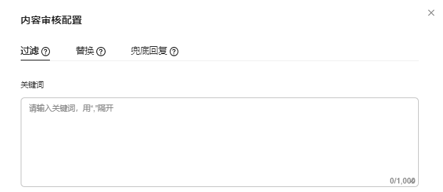 - 内容审核和安全护栏无法同时开启,打开内容审核配置开关后,“安全防护”将自动关闭。