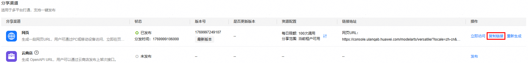 在渠道管理页面,网页分享渠道的操作列单击“发布”按钮后将出现“立即访问”、“复制链接”、“重新生成”文字按钮。这里可以通过两种方式访问agent应用的网页应用链接,同时支持重新生成发布链接。