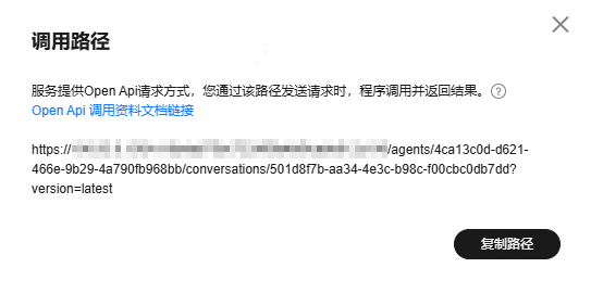 - 弹出复制成功对话框,用于填写调用agent应用接口的agent_id字段。