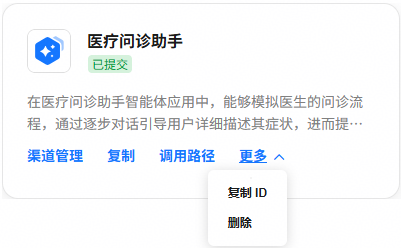 在agentarts中创建应用之后,可以管理单智能体应用界面中的应用,可执行删除、复制创建的应用、复制应用id、导入、导出及查看调用路径等。