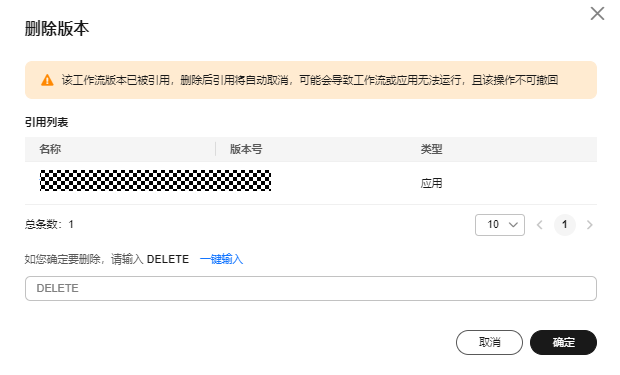 - 如果工作流版本已被引用,删除后引用将被自动取消,可能会导致工作流或智能体无法运行,且该操作不可撤回。