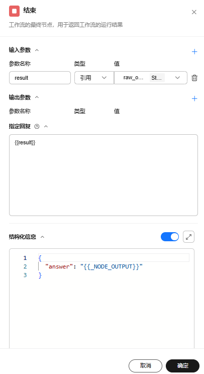 结束节点是工作流的最终节点,用于返回工作流运行后的结果。