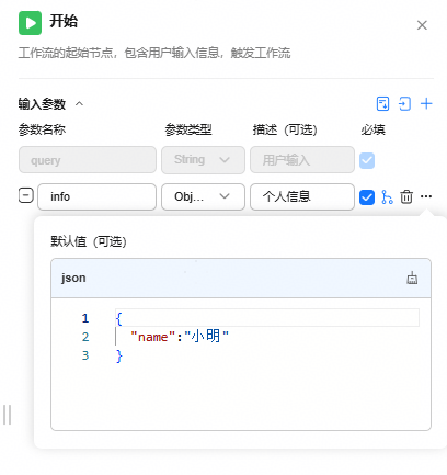 - 是否必选: 参数是否必选。如果未指定必选参数,工作流无法执行。当将工作流绑定到智能体中使用时,如果用户查询中缺少必选参数,则不会触发该工作流。