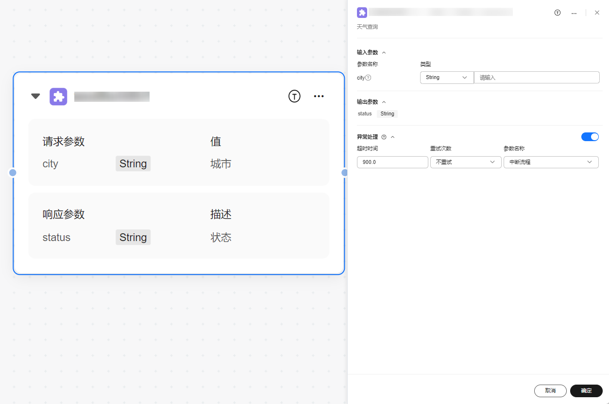 - 返回设定内容:节点发生异常后,工作运行不会中断,用户可自定义设置需要返回的输出字段内容,必须是输出参数中已定义的字段,且格式为合法的json格式。